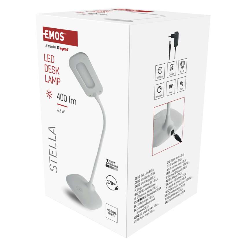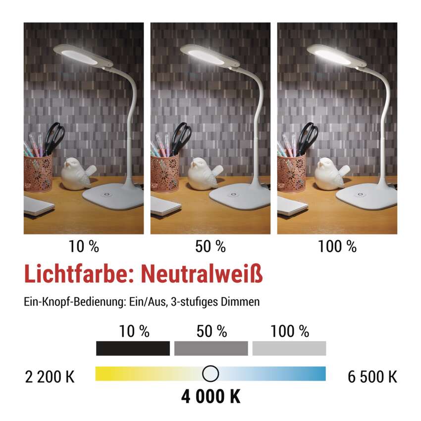 Dank der 3-stufigen Dimmfunktion können Sie die Lichtintensität ganz einfach an Ihre aktuellen Bedürfnisse anpassen – von voller Arbeitshelligkeit bis hin zu angenehm gedämpftem Licht für gemütliche Abende.