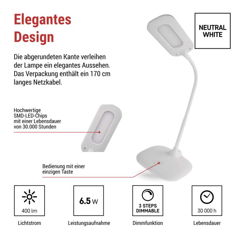 Die stilvolle und funktionale LED-Lampe in Weiß bietet erstklassige Beleuchtung für Arbeit, Studium und abendliche Entspannung. Mit einer hellen Lichtleistung von 400 lm, einem geringen Verbrauch von 6,5 W und einem angenehmen neutralen Weiß von 4 000 K schafft sie optimale Bedingungen für Konzentration und Entspannung.