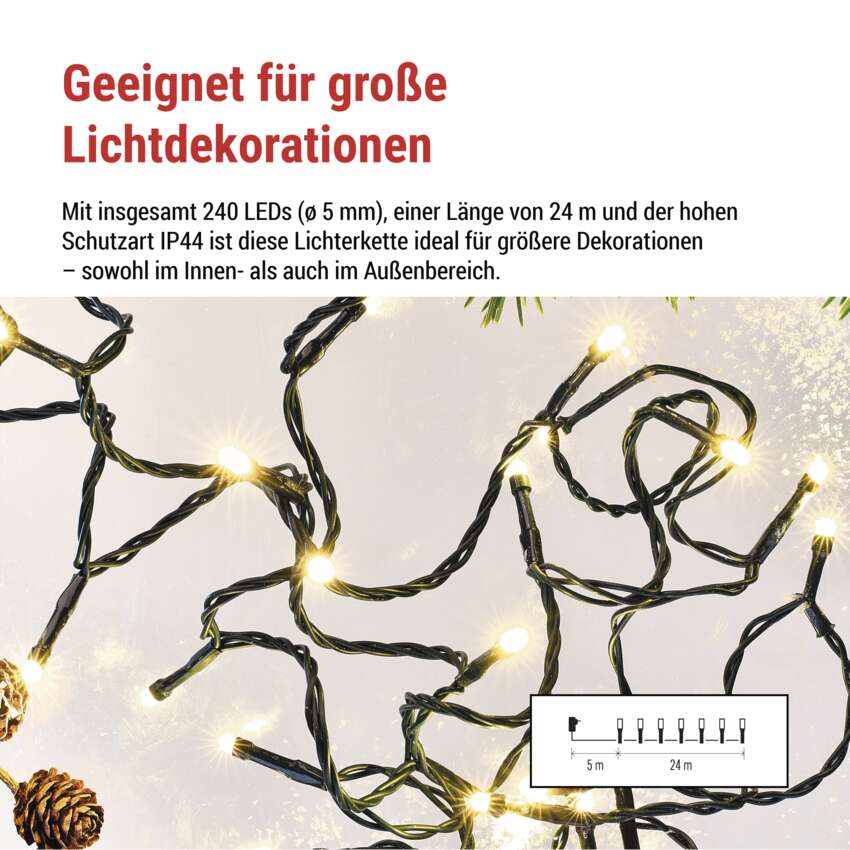 Erleuchten Sie Ihr Zuhause mit einem Licht, das Frieden, Harmonie und die wahre Magie von Weihnachten bringt. Diese 24 Meter lange LED-Weihnachtskette mit warmweißer Farbe erzeugt einen eleganten und sauberen Effekt, der sowohl moderne als auch klassische Weihnachtsdekorationen ergänzt.