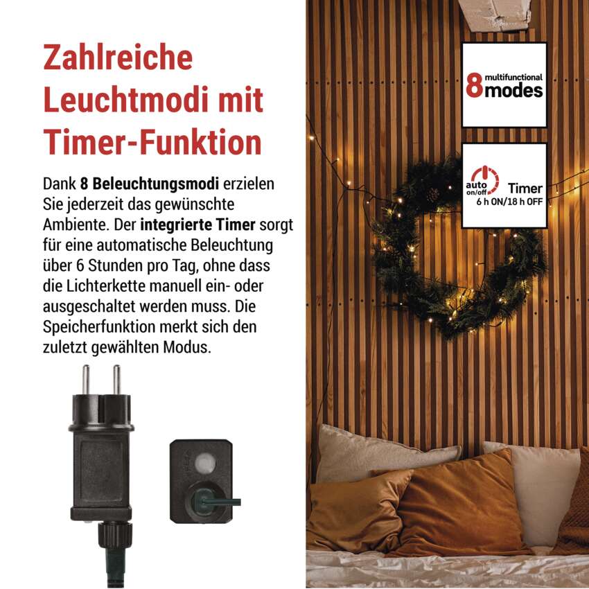 Ein integrierter Timer mit einem automatischen Zyklus von 6 Stunden an und 18 Stunden aus sorgt dafür, dass die Lichterkette genau dann ein- und ausgeschaltet wird, wenn Sie sie brauchen. Einfach mit einer Berührung aktivieren und die Lichterkette leuchtet jeden Tag zur gleichen Zeit - kein manuelles Schalten erforderlich. So kannst du die weihnachtliche Atmosphäre ganz unbeschwert genießen.