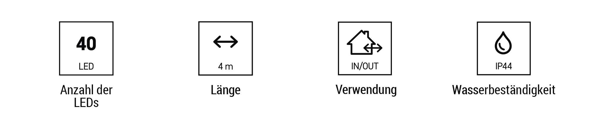 Die Kette enthält 40 hochwertige LEDs mit einem Stromverbrauch von nur 3,6 W, was sie sehr energieeffizient macht. Das Licht ist hell, gleichmäßig und dennoch schonend für Augen und Umwelt. Die LED-Lebensdauer erreicht bis zu 10.000 Stunden Licht, was jahrelange zuverlässige Nutzung ohne Austausch und Sorgen bedeutet.