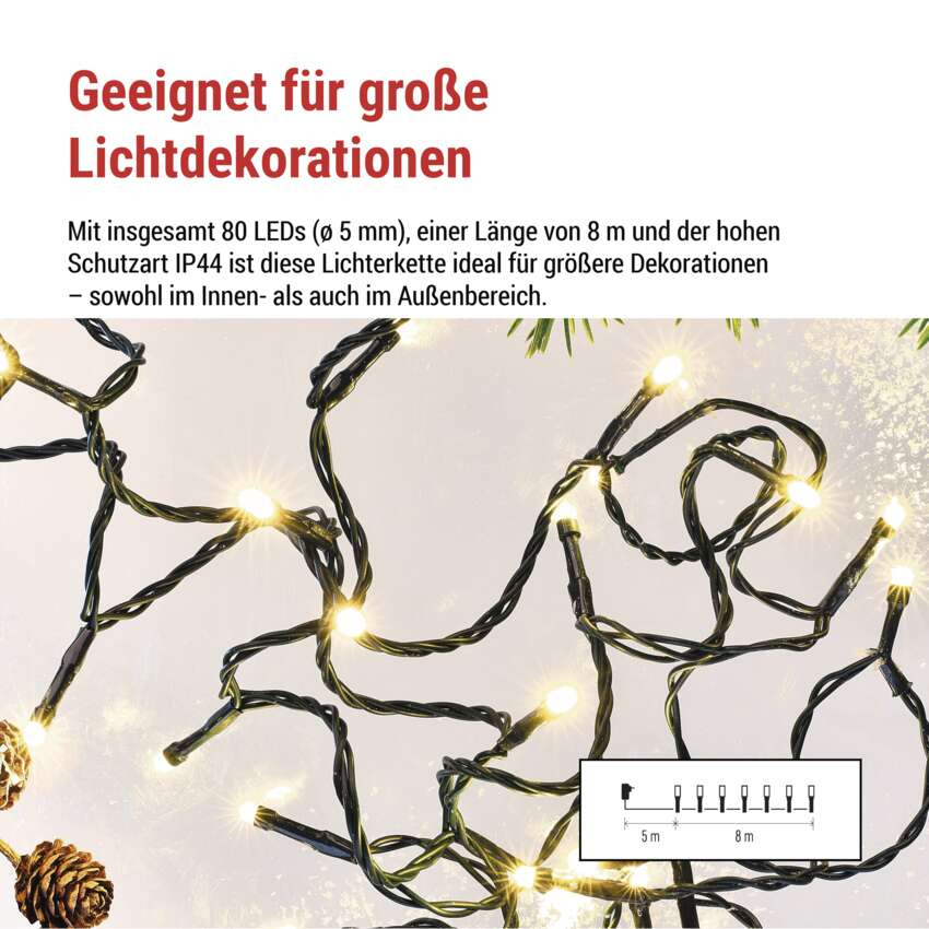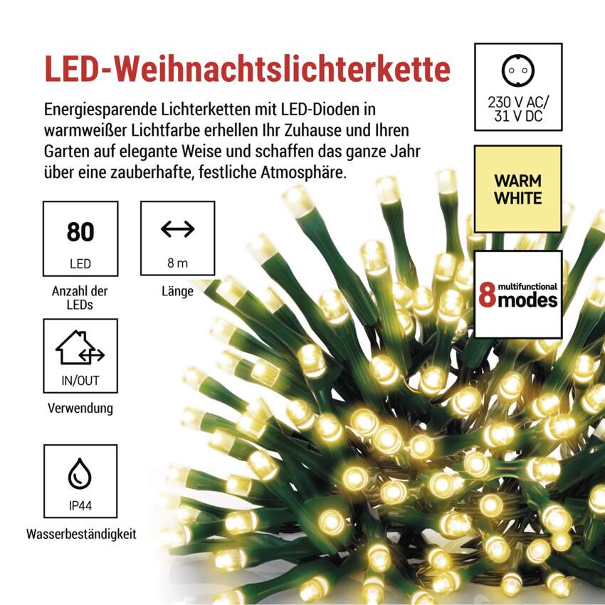 Erleuchten Sie Ihr Zuhause mit einem Licht, das Frieden, Harmonie und die wahre Magie von Weihnachten bringt. Diese LED-Weihnachtskette mit einer Länge von 8 Metern und einer Lichtfarbe von warmweiß erzeugt einen eleganten und sauberen Effekt, der sowohl moderne als auch klassische Weihnachtsdekorationen perfekt ergänzt.