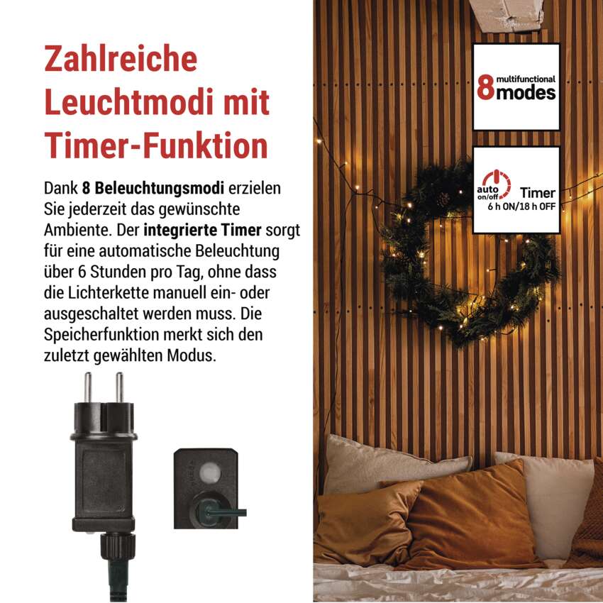 Ein integrierter Timer mit einem automatischen Zyklus von 6 Stunden an und 18 Stunden aus sorgt dafür, dass die Lichterkette genau dann ein- und ausgeschaltet wird, wenn Sie sie brauchen. Einfach mit einer Berührung aktivieren und die Lichterkette leuchtet jeden Tag zur gleichen Zeit - kein manuelles Schalten erforderlich. So kannst du die weihnachtliche Atmosphäre ganz unbeschwert genießen.