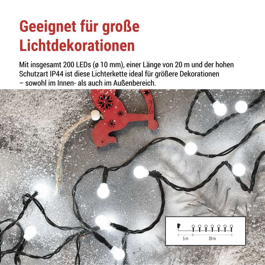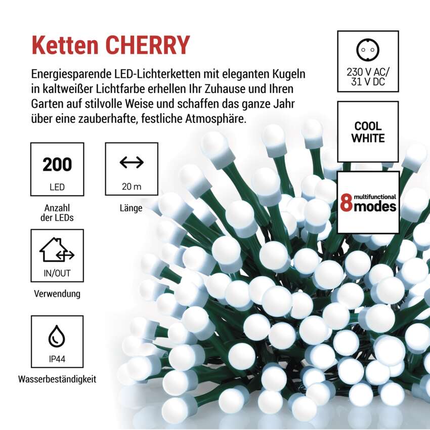 LED Weihnachtslichterkette Cherry – Kugeln, 20 m, Außen und Innen,kaltweiß,Programme,Timer