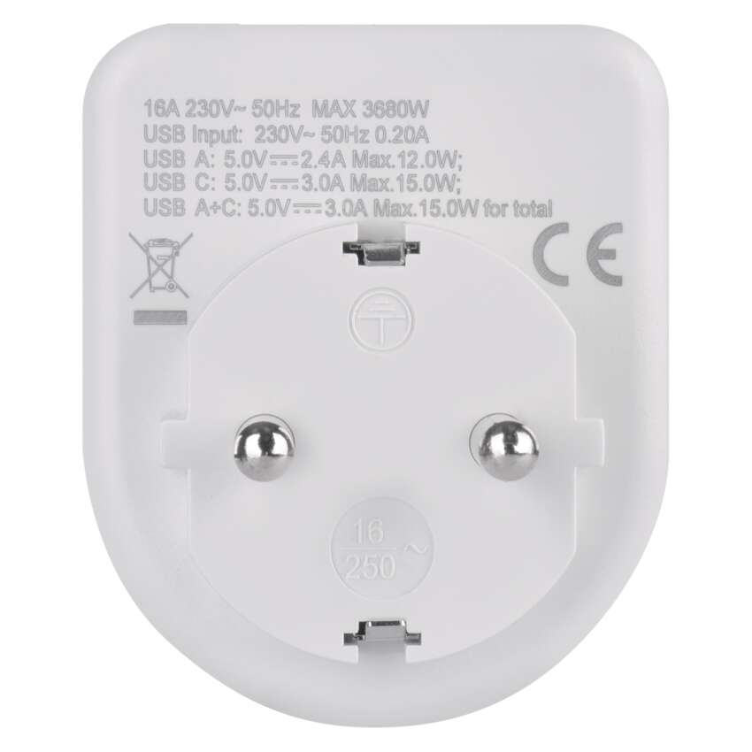 | Produkt | Mehrfachsteckdose 1× + 1× USB-A 5 V DC/2,4 A/ 12 W + 1× USB-C 5 V DC/ 3 A/ 15 W, Total A+C: 3 A/ 15 W max. |