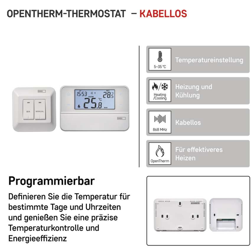 Erhalten Sie den ultimativen thermischen Komfort und Kontrolle über Heizung und Kühlung zu Hause und im Büro. Das Thermostat ermöglicht eine zuverlässige Steuerung von Heiz- und Kühlsystemen und Programmierung von bis zu sechs Temperaturänderungen pro Tag. Es passt sich das ganze Jahr über Ihrem Lebensrhythmus an. Dank des kabellosen Designs können Sie ganz einfach den Referenzraum wechseln. Zu den Vorteilen gehören ein hintergrundbeleuchtetes Display, eine einfache Bedienung, Temperatureinstellungen von 5°C bis 35°C sowie Urlaubs- und Sperrfunktionen. Sie können einen Heizkessel anschließen, der die OpenTherm-Kommunikation unterstützt, sowie eine konventionelle Schaltung über einen Schaltkontakt (Relais)