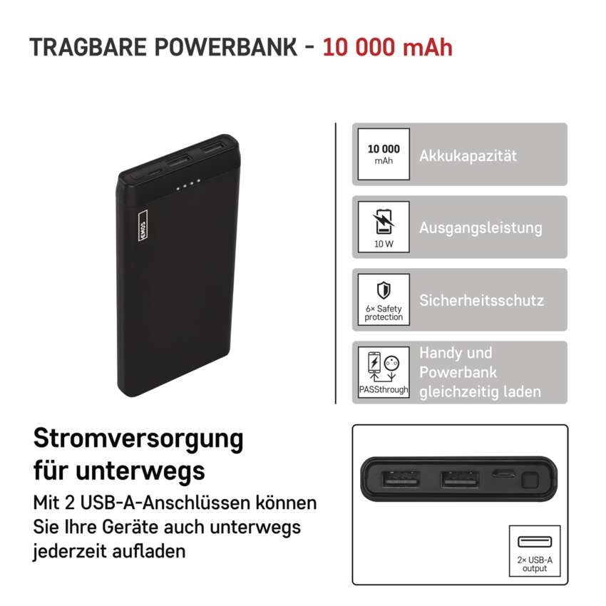 PowerbankDie EMOS Alpha 10S kann problemlos mit einem leeren Tablet und einem Mobiltelefon umgehen. Wo auch immer Sie sind. Sie können Ihr Gerät über bis zu zwei USB-Kabel (Micro-USB und USB-C) anschließen, die im Paket enthalten sind und neben Strom auch Daten übertragen können. Diese Powerbank wird Sie nicht nur durch ihr schlankes Design mit idealen Abmessungen glücklich machen.Sympathische Kapazität 10.000 mAhund sechs intelligente Sicherheitsfunktionen können Ihre Elektronik schnell und sicher aufladen.
