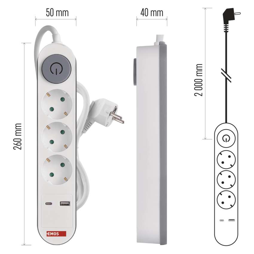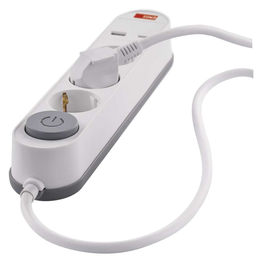 Steckdosenleiste 2 m / 3 Steckdosen / Schalter / weiß / 1× USB-A + 1× USB-C / 1,5 mm2