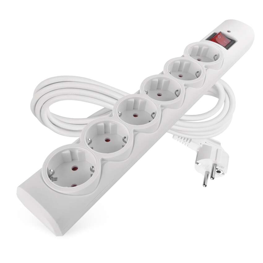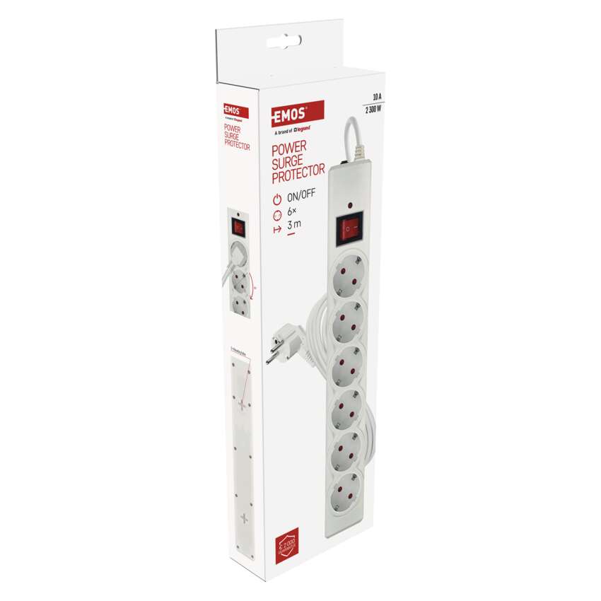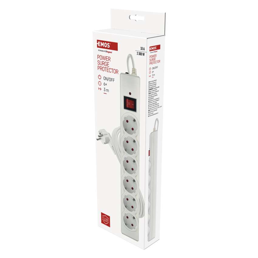 Hochwertiger Überspannungsschutz mit 6 Steckdosen, 3 m langem PVC Kabel mit 1,5 mm² Leiter und praktischem Schalter. Schützt die angeschlossenen Geräte vor Überspannung und Stromstößen. Die maximale Belastung von 2.300 W (10 A) ermöglicht den sicheren gleichzeitigen Betrieb mehrerer Geräte in Innenräumen. Wiedereinschaltbare Sicherung - einfache Wiederherstellung der Stromversorgung nach Überlastung.
