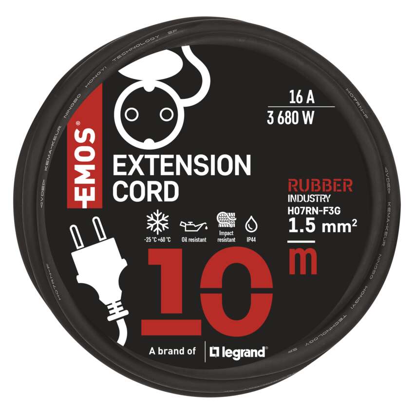Verlängerungskabel 10 m / 1 Steckdose / schwarz / Gummi-Neopren / 250 V / 1,5 mm2