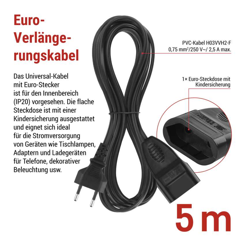 Die zweiadrige Verlängerungsschnur mit einer Steckdose ist für den Anschluss von Geräten mit geringem Stromverbrauch vorgesehen. Das PVC-Kabel mit einem Querschnitt von 0,75 mm² ist für den Innenbereich im Haushalt geeignet. Kindersicherungen schützen Kinder vor Gefahren. Kabellänge 5 m.