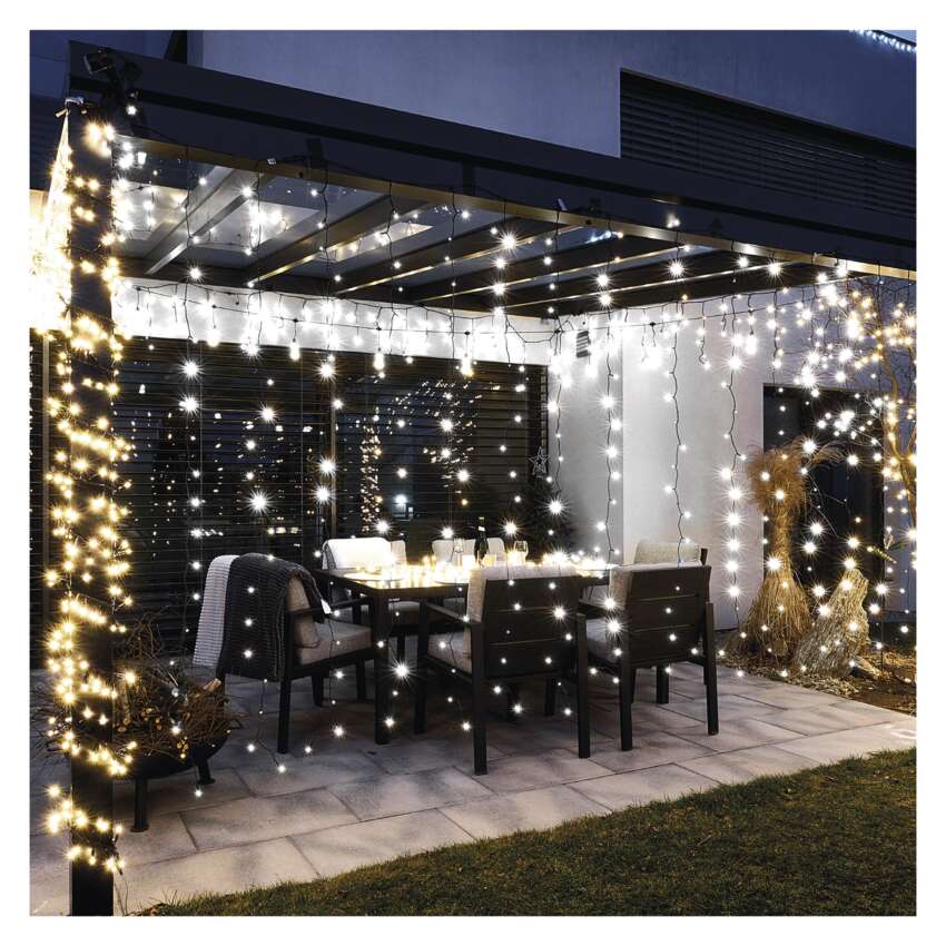 Die einzelnen LED-Leuchtelemente (C) des CONNECT SYSTEMs in den Ausführungen STANDARD und PROFI können zusammengeschaltet werden, kombinieren und mit Hilfe von Verlängerungskabeln und Splittern (B) verzweigen und dekorieren Sie damit auch entlegene Standorte. Durch die schrittweise Erweiterung mit zusätzlichen Komponenten ist es möglich, eine professionelle und umfangreiche Beleuchtung ohne hohe Anfangsinvestitionen zu erreichen. Die zusammenhängende LED-Beleuchtung ist daher die ideale Wahl für spektakuläre Außendekorationen, bei denen herkömmliche Kettenlängen nicht ausreichen. Jeder kann das System tatsächlich installieren.