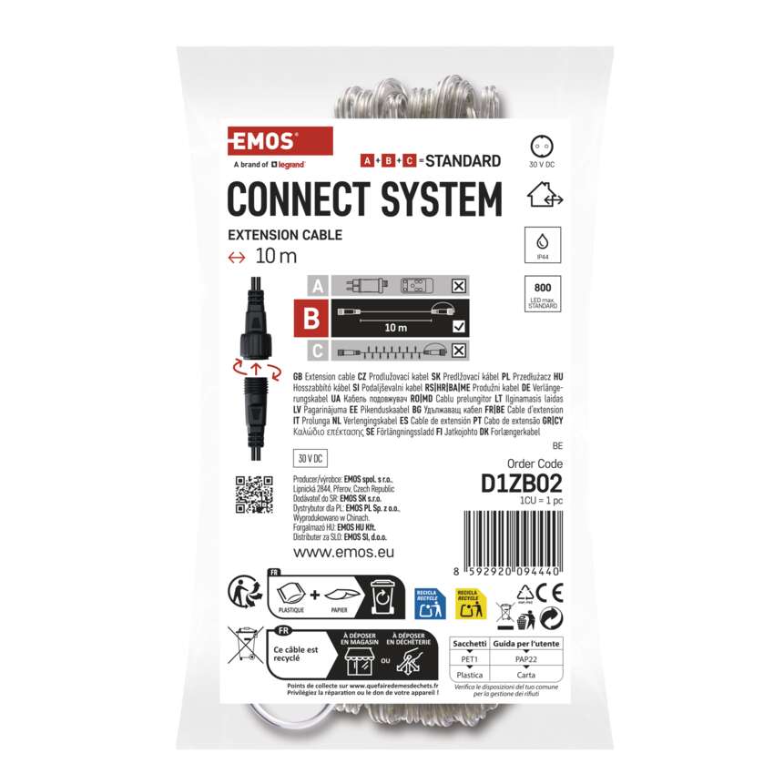 Die einzelnen LED-Leuchtelemente (C) des Verbindungssystems CONNECT SYSTEM in den Varianten STANDARD und PROFI können zusammengeschaltet werden, Kombiniert und mit Hilfe von Verlängerungskabeln und Splittern (B) verzweigen und schmücken sie auch entlegene Orte. Durch die schrittweise Erweiterung mit zusätzlichen Komponenten ist es möglich, eine professionelle und umfangreiche Beleuchtung ohne hohe Anfangsinvestitionen zu erreichen. Die zusammenhängende LED-Beleuchtung ist daher die ideale Wahl für spektakuläre Außendekorationen, bei denen herkömmliche Kettenlängen nicht ausreichen. Jeder kann das System tatsächlich installieren.