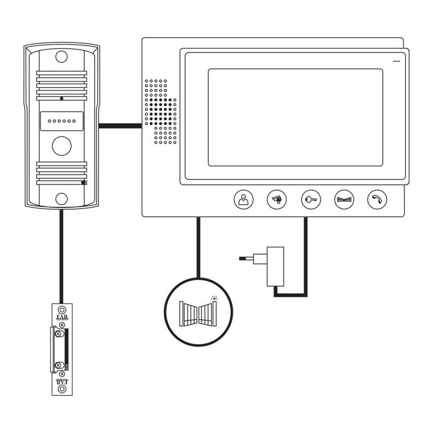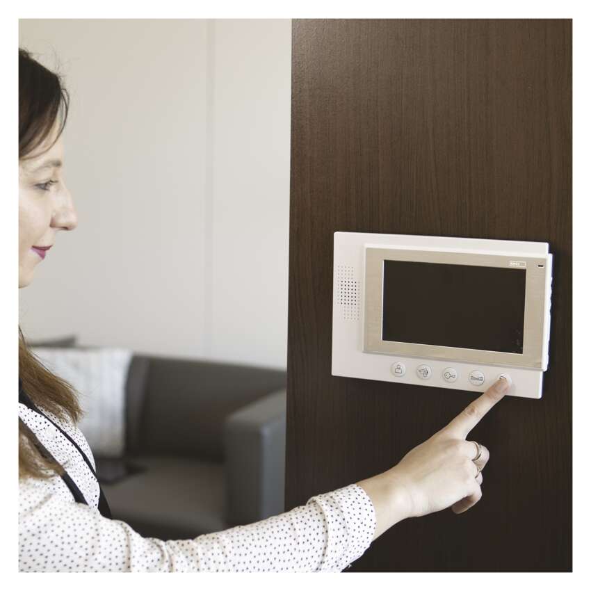Einfaches Türvideoanlage-Set. Das Bild wird auf einem großen 7"-LCD-Farbdisplay angezeigt. Das Gerät wird durch den mitgelieferten 12V-Adapter versorgt. Das Gerät ermöglicht die Bedienung des Türschlosses und der Torbewegung.