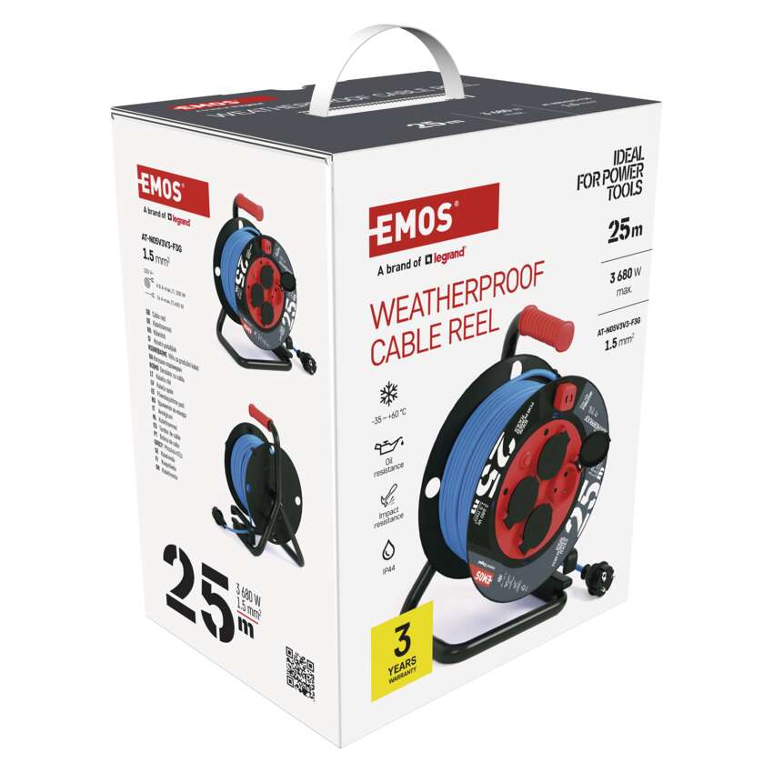 Blaues PVC-Kabel hält rauen Bedingungen genauso gut stand wie Gummikabel. Wetterfeste Rollen resistieren gröberen Verwicklungen und behalten dabei ihre große Flexibilität erleichtern die gesamte Handhabung. Im Vergleich zu herkömmlichen orangefarbenen PVC-Kabeln können wetterfeste Trommeln dank ihrer Wasserdichtigkeit mit IP44-Schutz auch bei Arbeiten im Freien eingesetzt werden. Die markante blaue Farbe sorgt für eine bessere Sichtbarkeit, ob im Gras oder im Schnee, und trägt so zu einer erhöhten Arbeitssicherheit bei.